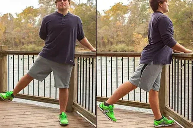 For at få en dybere strækning skal du skubbe begge dine hofter fremad. Hold i 20-30 sekunder. Gentag med dit andet ben. Hold en stol til balance om nødvendigt.