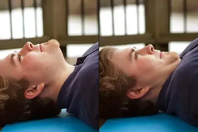 Lig på ryggen. Uden at løfte hovedet fra gulvet, sæt din hage lidt ind mod brystet. Hold i 5 til 10 sekunder. Gentag 3 til 5 gange.