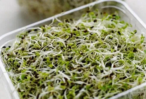 Spis ikke nogen rå spirer inklusive alfalfa -kløver og radise. Bakterier kan komme ind i frøene, før spirerne begynder at vokse, og disse bakterier er næsten umulige at vaske væk. Ved deli -tjek sandwich for at sikre, at de ikke indeholder rå spirer. Hjemme kog spirer grundigt for at ødelægge alle bakterier.
