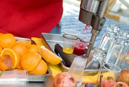 Frisk sejet juice i restauranter Juice barer eller gårdstande er muligvis ikke pasteuriseret for at beskytte mod skadelige bakterier inklusive Salmonella og E. coli . Nogle markeder sælger også rå upasteuriseret juice i den kølede sag - se efter den krævede advarselsetiket og undgå det. Gravide kvinder skal vælge juice, der er pasteuriseret. Juice i kasser og flasker på din supermarkedshylde er også sikker.