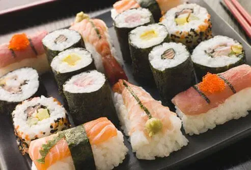Beklager sushi-fans, men det er tid til en 9-måneders hiatus fra denne godbid. Selvom fisk og skaldyr er en stor kilde til protein -rå skaldyr kan være en kilde til skadelige parasitter og bakterier. FDA anbefaler, at gravide kun spiser fisk og anden skaldyr, der er kogt grundigt.