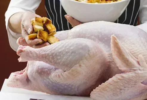 En forudfyldt kalkun eller kylling tilbyder en god genvej, når du er presset i tide. Men saften fra frisk rå fjerkræ kan blandes med fyldningen og skabe et fantastisk sted for bakterier at vokse. Madlavning tilbyder normalt beskyttelse, men graviditet gør det sværere at bekæmpe infektioner. Et sikkert alternativ er at købe frosne forudfyldte fjerkræ. Sørg for at koge det direkte fra frosset - lad det ikke afrime først. Lårkødet skulle ramme 180 F.